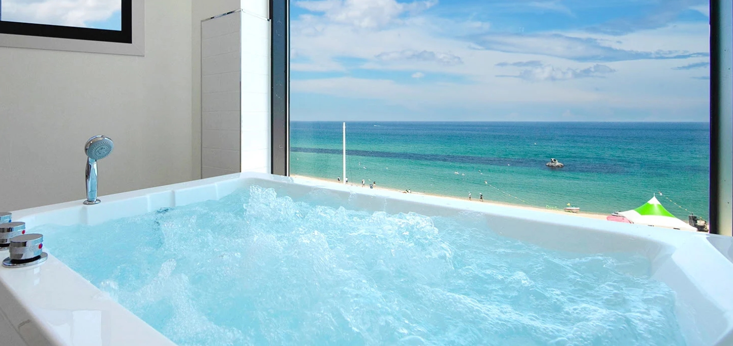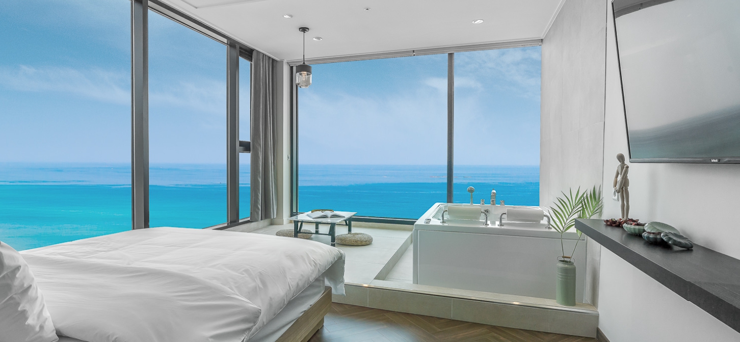 힐링을 위한 여행, 그 안목을 높이다.라는 슬로건으로 룸별로 개별 스파를 즐길 수 있습니다. 전 객실 안목해변 오션뷰로 함께하는 인원수에 맞추어 예약하시면 됩니다. 건물 주차장이 별도로 마련되어 있어 자차이용 시 불편함이 없습니다. 시간에 상관없이 개별 월풀 스파를 이용할 수 있고, 마찬가지로 입욕제 사용이 가능합니다.