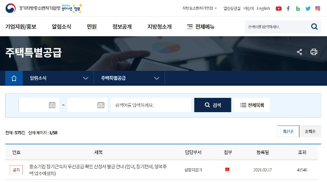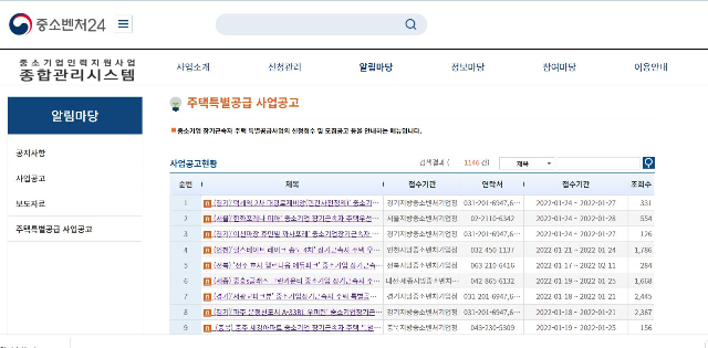 일반적으로 청약 홈에 모집공고가 뜨는 일반 특별공급보다 약 한 달 정도 전에 각 지역 중소벤처 기업청 홈페이지에 모집공고가 등록되어 원하는 아파트가 있는지 미리 찾아볼 수 있습니다.