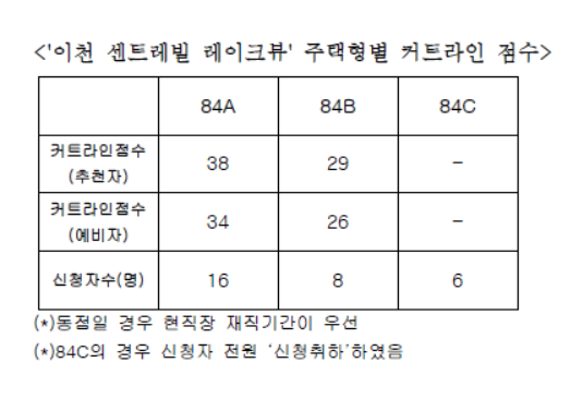110점 만점으로 청약의 일반공급에 비해 커트라인이 상대적으로 낮은 것을 확인할 수 있습니다. 인기지역의 경우 커트라인이 높은 편이니 관심 있는 지역의 모집공고 및 발표를 참고하시면 될 것 같습니다.